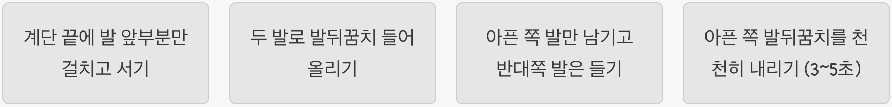 계단 끝에 발의 앞부분만 걸치고 서서, 두 발로 발뒤꿈치를 들어 올린 뒤, 아픈 쪽 발만 남기고 반대쪽 발은 공중으로 듭니다. 그 다음, 아픈 쪽 발의 뒤꿈치를 계단보다 아래로 3~5초에 걸쳐 아주 천천히 내려줍니다. 이 동작은 손상된 힘줄의 회복을 돕고 조직을 튼튼하게 재정렬하는 효과가 있습니다.