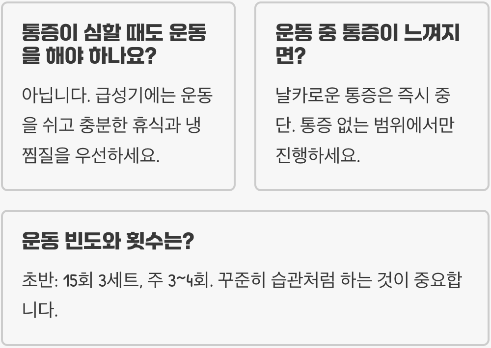 A. 아닙니다. 붓고 열이 나며 통증이 심한 급성기에는 운동을 쉬고 충분한 휴식과 냉찜질을 하는 것이 우선입니다. 여기서 소개한 운동은 통증이 어느 정도 가라앉은 회복기나 예방 차원에서 하는 재활 운동입니다.