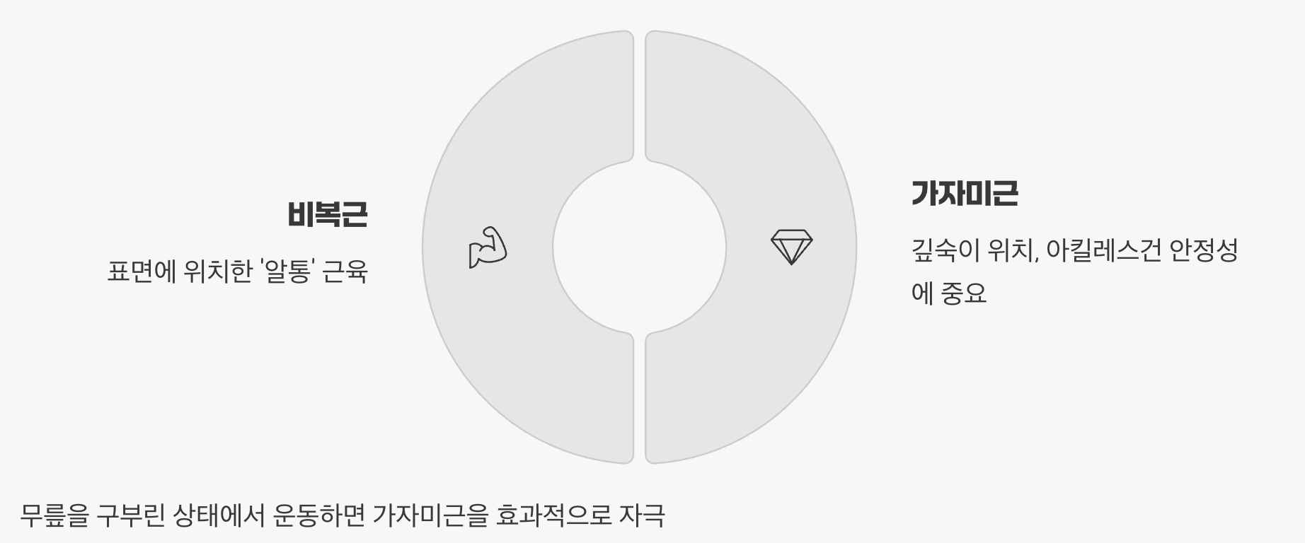 우리의 종아리 근육은 흔히 '알통'이라고 부르는 비복근과 그 아래 깊숙이 위치한 가자미근으로 이루어져 있습니다. 일반적으로 서서 하는 카프 레이즈는 주로 비복근을 단련시키는데, 아킬레스건의 안정성에 더 큰 영향을 미치는 '가자미근'을 강화하는 것도 매우 중요합니다.