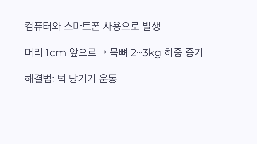 현대인의 고질병인 '거북목 증후군'은 어깨 통증의 가장 대표적인 숨은 원인입니다. 컴퓨터 모니터나 스마트폰을 보기 위해 무의식적으로 고개를 앞으로 쭉 내미는 자세는, 목과 어깨 주변 근육에 엄청난 부담을 줍니다. 우리 머리의 무게는 볼링공 하나와 비슷한데, 목이 1cm 앞으로 나갈 때마다 목뼈는 2~3kg의 하중을 더 받게 됩니다.