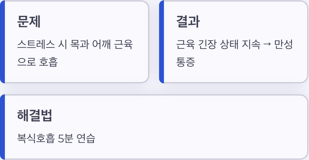 스트레스를 받거나 긴장하면 자신도 모르게 숨을 얕고 빠르게 쉬게 됩니다. 이때 우리는 본래 숨을 쉴 때 사용해야 하는 깊은 곳의 횡격막 대신, 목과 어깨 주변의 작은 근육들을 사용해 억지로 숨을 쉬게 됩니다.