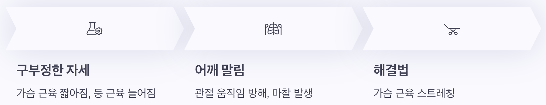 거북목과 항상 함께 찾아오는 불청객이 바로 '굽은 등', 즉 라운드 숄더입니다. 오랜 시간 구부정하게 앉아 있으면 가슴 앞쪽 근육은 점점 짧아지고 타이트해지는 반면, 등 쪽 근육은 힘없이 늘어지게 됩니다. 이렇게 앞뒤 근육의 균형이 깨지면 어깨는 자연스럽게 앞으로 말리게 됩니다.