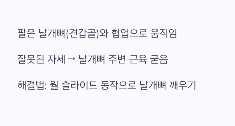 하지만 잘못된 자세가 오래되면 날개뼈 주변의 근육들이 뻣뻣하게 굳어버리고, 날개뼈는 제 역할을 하지 못하게 됩니다. 결국 어깨 관절이 무리하게 모든 움직임을 감당하게 되면서 통증이 발생하는 것입니다. 이 문제를 해결하려면 '날개뼈 움직이기'에 집중해야 합니다. 팔을 크게 돌리거나, 벽에 등을 대고 팔을 위아래로 움직이는 '월 슬라이드' 동작을 통해 굳어있던 날개뼈를 깨워주세요.