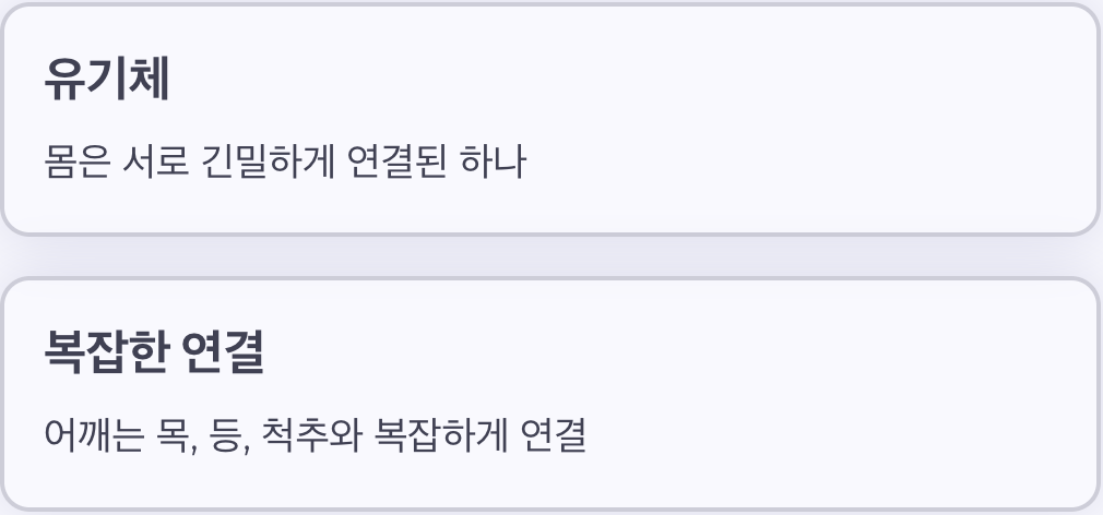 우리 몸은 각각의 부위가 따로 움직이는 기계가 아니라, 서로 긴밀하게 연결된 하나의 유기체와 같습니다. 특히 어깨 관절은 목과 등, 척추, 날개뼈(견갑골) 등 수많은 근육과 신경들이 복잡하게 얽혀 있어, 주변부의 작은 문제만으로도 큰 영향을 받습니다.