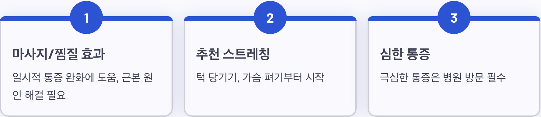 A. 네, 일시적인 통증 완화에는 분명 도움이 됩니다. 마사지나 찜질은 긴장된 근육을 이완시키고 혈액순환을 촉진하여 불편함을 줄여줍니다. 하지만 이는 근본적인 원인 해결이 아니므로, 통증이 계속된다면 위에서 제시한 것처럼 목과 등의 자세를 바로잡는 노력을 반드시 병행해야 합니다.