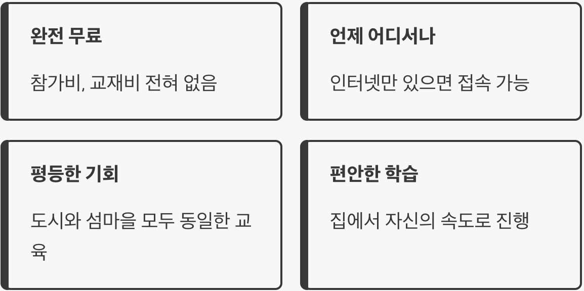 비싼 코딩 학원비 때문에 망설이셨던 분들에게 이 행사는 가뭄의 단비와도 같습니다. 별도의 참가비나 교재비가 전혀 들지 않고, 인터넷이 연결된 컴퓨터나 태블릿만 있으면 언제 어디서든 접속할 수 있기 때문입니다. 도시뿐만 아니라 섬마을에 사는 친구들도 똑같이 양질의 소프트웨어 교육을 받을 수 있는 평등한 기회의 장입니다.