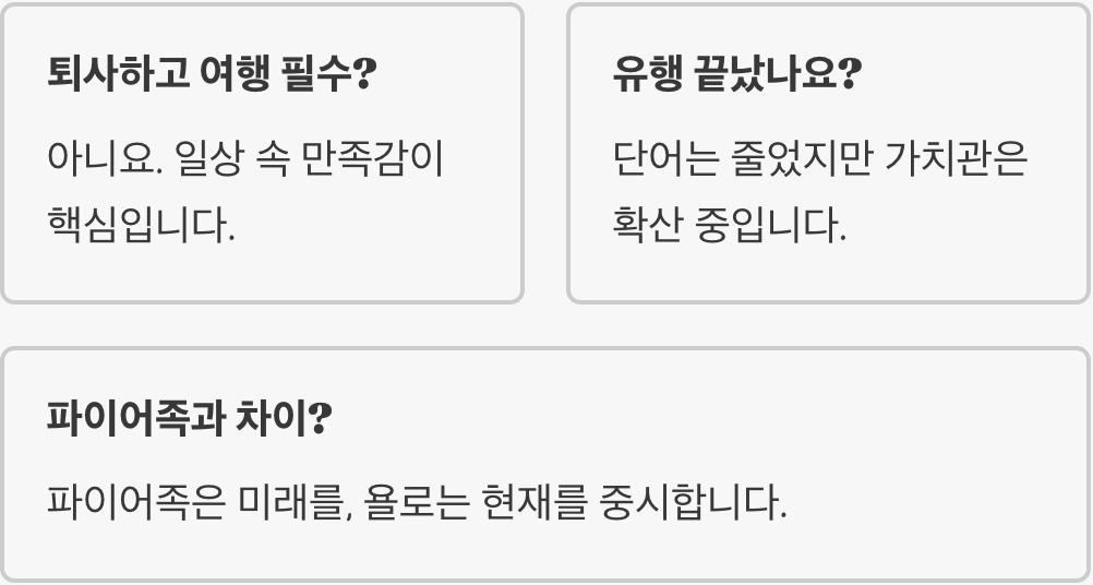 A. ‘욜로’라는 단어 자체의 사용 빈도는 줄었지만, 그 속에 담긴 가치관, 즉 ‘현재의 행복과 경험을 중시하는 삶’은 오히려 다양한 형태로 우리 사회에 더욱 깊숙이 자리 잡고 있습니다. 워라밸(Work-Life Balance)을 중시하는 문화나, ‘N잡러’, ‘사이드 프로젝트’ 열풍 등도 결국은 현재의 만족과 자아실현을 추구한다는 점에서 욜로의 연장선으로 볼 수 있습니다.