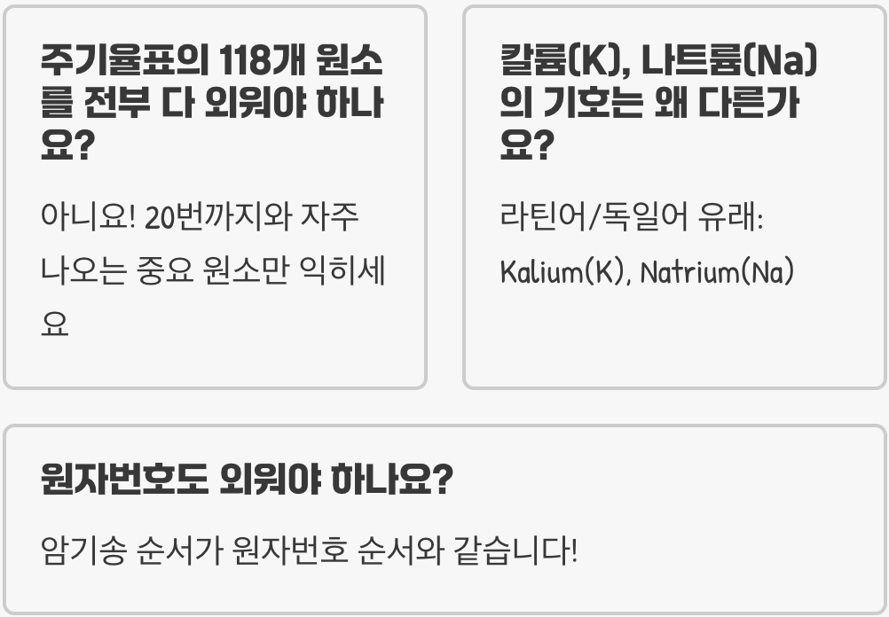 “수헬리베 붕탄질산 플네나마 알규인황 염아칼칼!” 자, 이 주문을 하나씩 풀어볼까요? 수(H)소, 헬(He)륨, 리(Li)튬, 베(Be)릴륨, 붕(B)소, 탄(C)소, 질(N)소, 산(O)소, 플(F)루오린, 네(Ne)온, 나(Na)트륨, 마(Mg)그네슘, 알(Al)루미늄, 규(Si)소, 인(P), 황(S), 염(Cl)소, 아(Ar)르곤, 칼(K)륨, 칼(Ca)슘! 여기까지, 20번까지의 원소들과 순식간에 친해졌습니다. 이것이 바로 모든 암기의 시작입니다.
