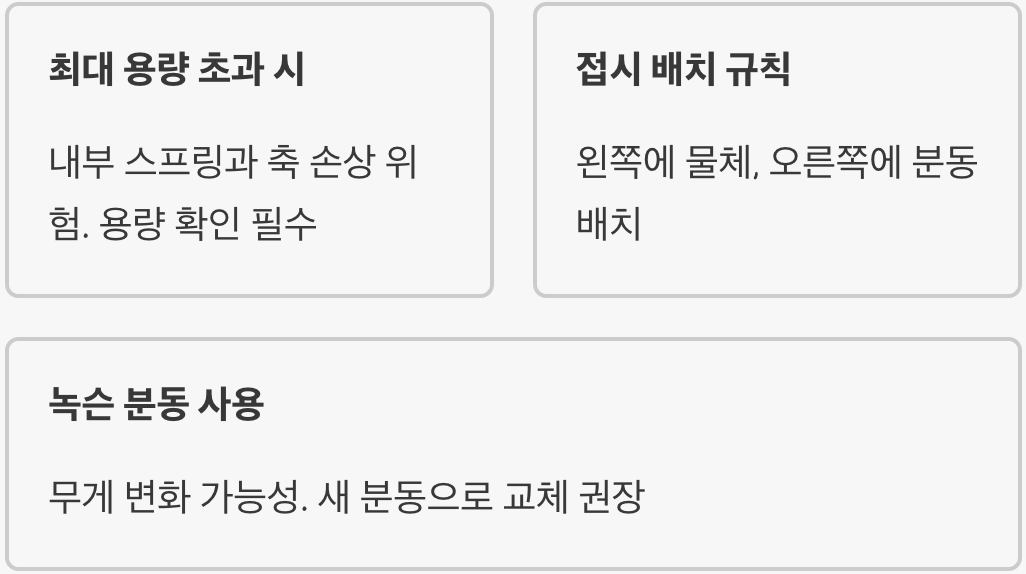 물건이나 분동을 접시의 가장자리에 놓는 것도 오차의 원인이 됩니다. 한쪽 구석에 무게가 실리면 접시가 비스듬해지면서 기구 내부의 축에 불필요한 마찰이 생깁니다. 이는 저울이 부드럽게 움직이는 것을 방해하여 바늘이 엉뚱한 곳에서 멈추게 만듭니다.