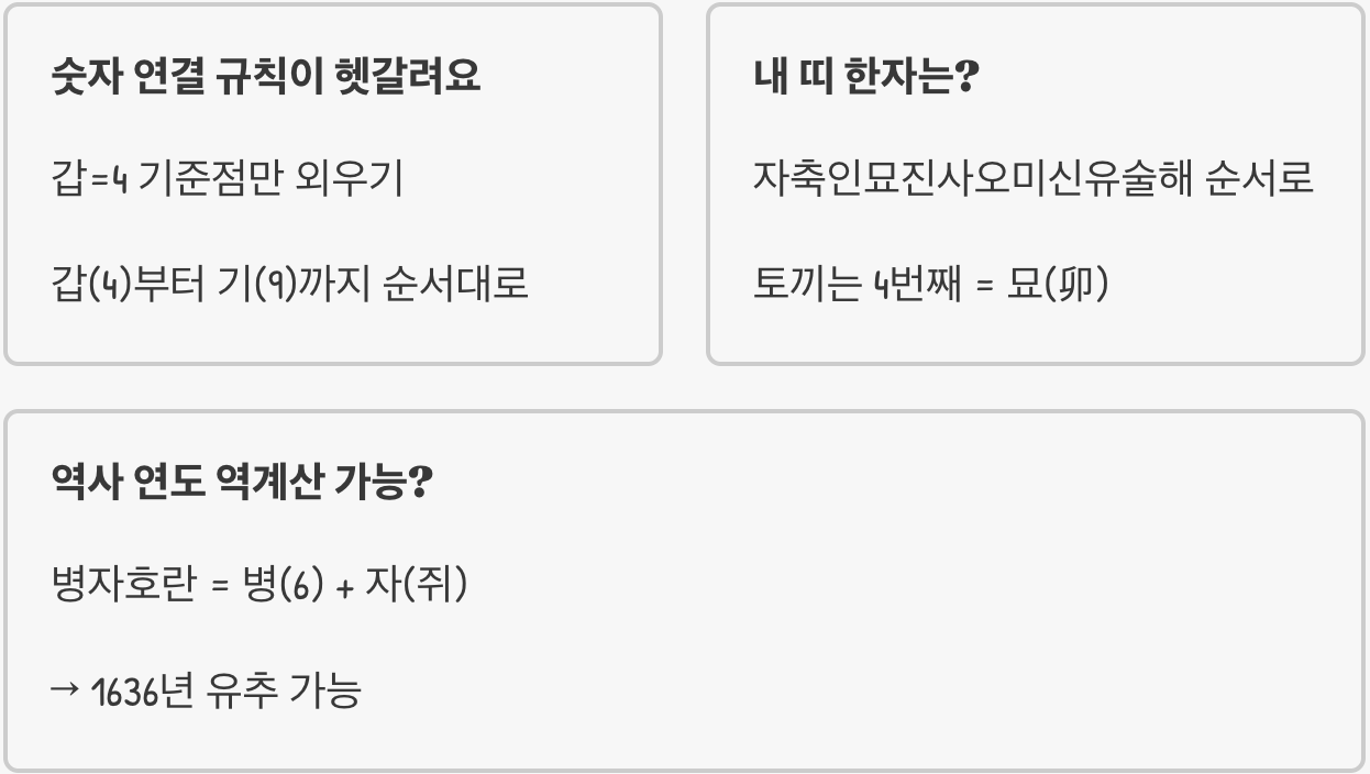 Q. 연도 끝자리 숫자와 십간 연결 규칙(갑-4, 을-5…)이 헷갈려요. 더 쉽게 외우는 법 없나요?