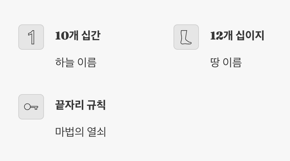 다음은 조금 낯설 수 있는 10개의 ‘십간(十干)’입니다. ‘갑(甲)-을(乙)-병(丙)-정(丁)-무(戊)-기(己)-경(庚)-신(辛)-임(壬)-계(癸)’. 처음에는 입에 잘 붙지 않지만, 딱 10개뿐이니 마음먹고 외우면 금방 익숙해집니다.