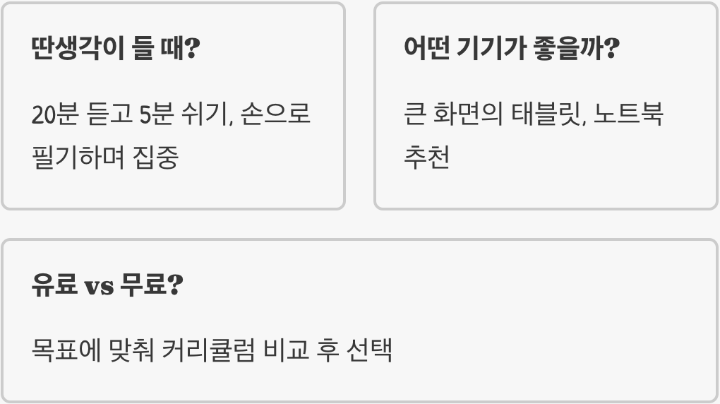 A. 강의 시간이 너무 길면 집중력이 떨어질 수 있습니다. 그럴 때는 20분 듣고 5분 쉬는 식으로 시간을 쪼개서 들어보세요. 또한 멍하니 화면만 보지 말고 선생님의 농담까지 받아 적겠다는 마음으로 손을 부지런히 움직이며 필기하면 딴생각을 막는 데 큰 도움이 됩니다.