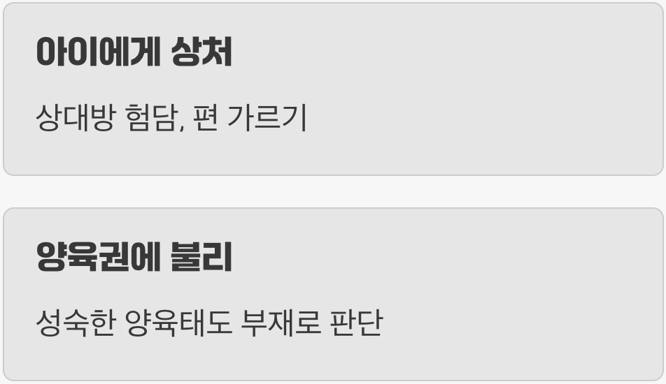 이혼 과정에서 가장 상처받는 존재는 바로 '자녀'입니다. 그럼에도 불구하고 "아빠가 나쁜 사람이야"라며 아이에게 상대방을 험담하거나, "말 안 들으면 엄마랑 못 살아"라며 아이를 자신의 편으로 만들기 위해 회유하고 압박하는 부모님들이 있습니다. 이는 아이에게 씻을 수 없는 상처를 주는 동시에, 양육권 분쟁에서 매우 불리한 요소로 작용합니다.
