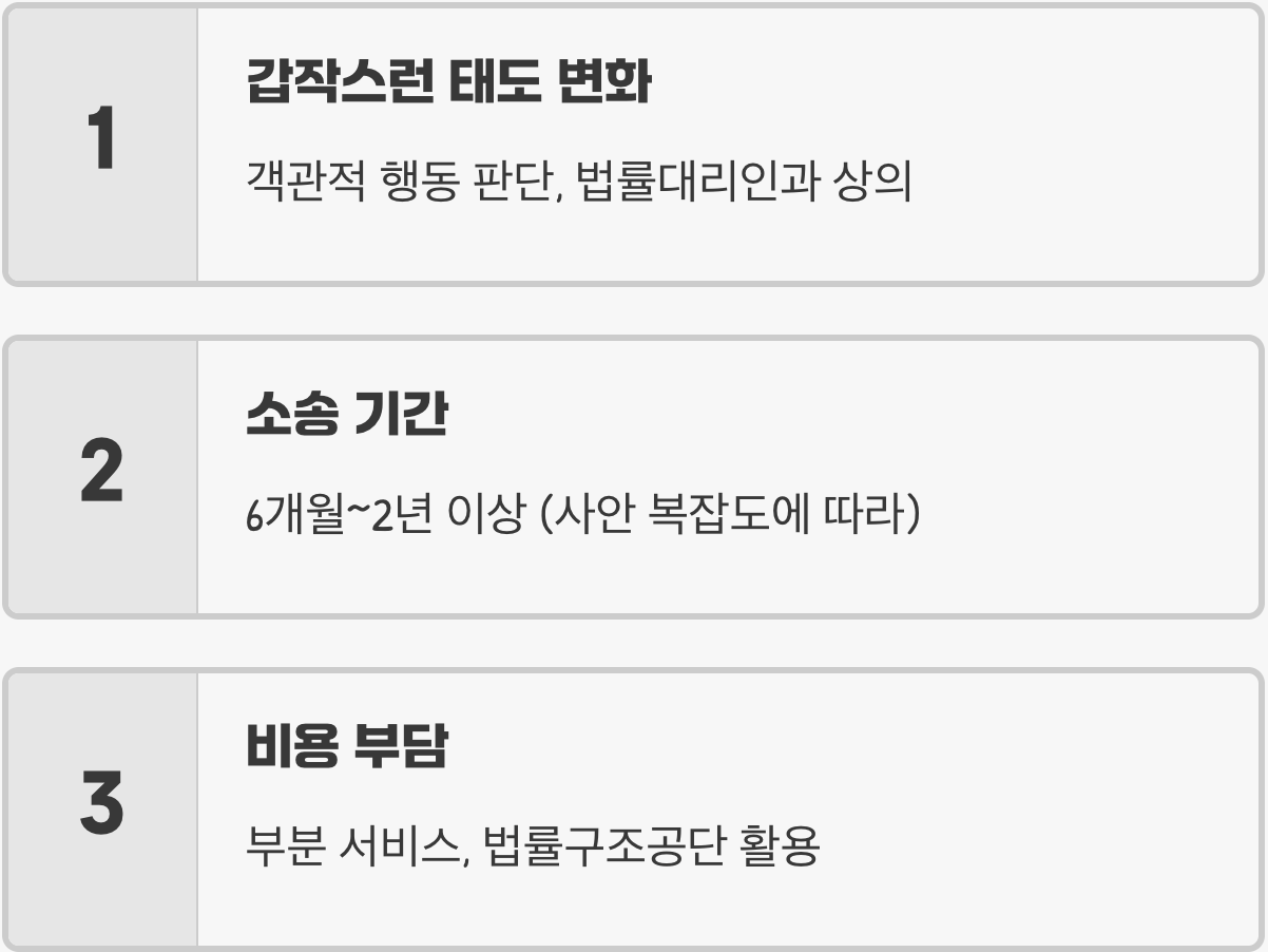 A. 소송을 유리하게 이끌기 위해, 혹은 시간을 벌기 위해 위장된 행동일 수 있으므로 신중하게 판단해야 합니다. 상대방의 태도 변화에 흔들려 소송을 취하했다가, 다시 불리한 상황에 놓이는 경우가 많습니다. 상대방의 말보다는 객관적인 행동과 상황을 보고 판단하며, 반드시 법률 대리인과 상의 후 결정해야 합니다.