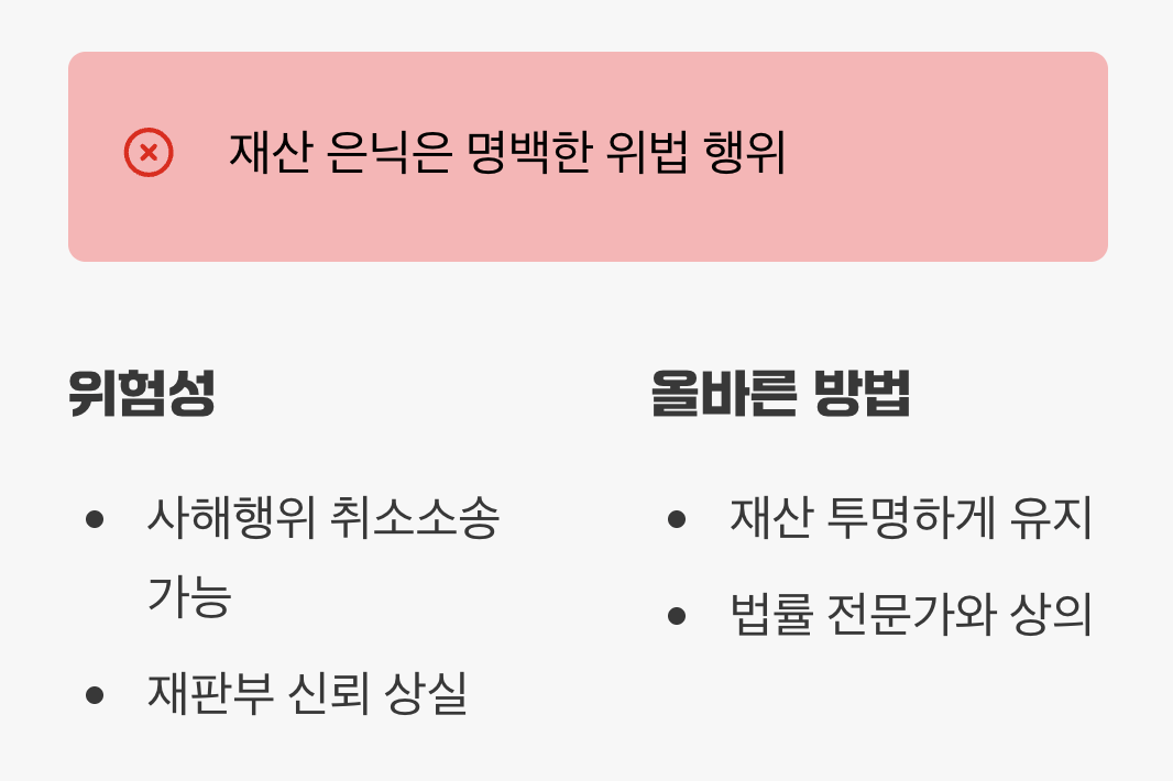 법원은 '사해행위 취소소송' 등을 통해 숨긴 재산을 다시 되돌릴 수 있으며, 이러한 행동은 재판부에게 신뢰를 잃게 만들어 위자료나 다른 조건에서도 불리한 판결을 받을 수 있습니다. 따라서 부부 공동의 재산은 소송이 끝날 때까지 투명하게 유지하고, 변호사 등 법률 전문가와 상의하여 정당한 권리를 주장하는 것이 가장 현명한 방법입니다.
