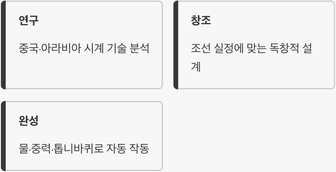 이 세 글자를 합치면 물이 흐르는 힘을 이용해 저절로 종이나 북을 쳐서 소리를 내는 장치라는 뜻이 완성됩니다. 이전까지 사용하던 물시계는 단순히 물이 차오르는 높이만 보여주었기 때문에, 사람이 계속 쳐다보고 있다가 "지금 몇 시입니다!" 하고 외쳐야 했습니다. 하지만 이 기계의 등장으로 조선은 '자동화'라는 놀라운 과학 기술의 시대를 맞이하게 된 것입니다.