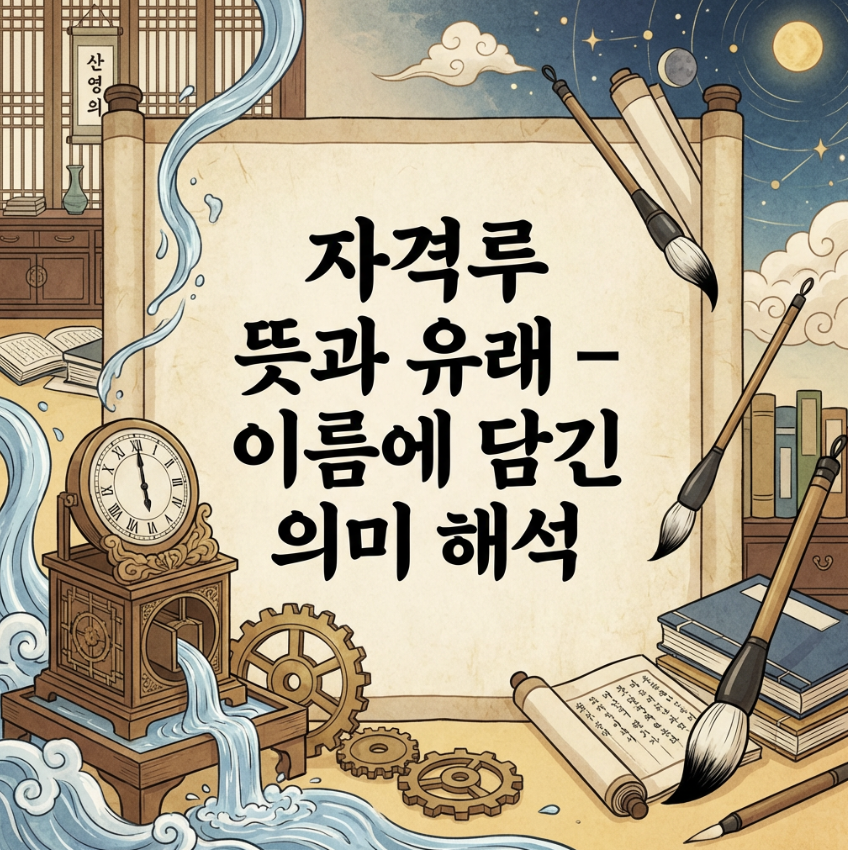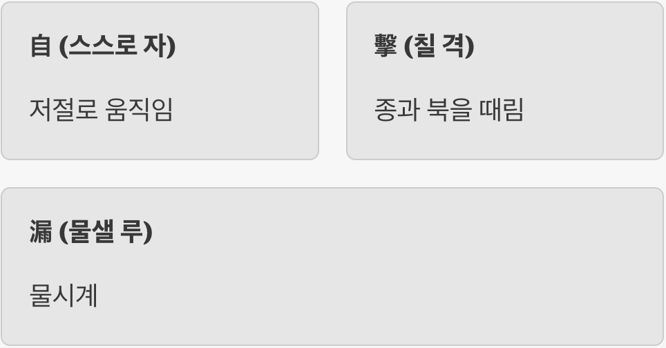 자격루라는 단어를 한 글자씩 뜯어보면 그 작동 원리가 머릿속에 그림처럼 그려집니다. 먼저 스스로 자(自)는 저절로 움직인다는 뜻이고, 칠 격(擊)은 무언가를 때린다는 의미입니다. 그리고 마지막으로 물 샐 루(漏)는 물이 똑똑 떨어지는 그릇, 즉 물시계를 말합니다.