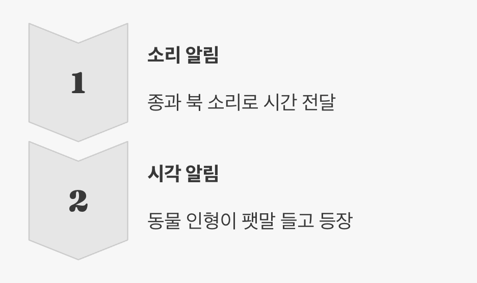 자격루는 단순히 댕댕 하고 종소리만 내는 것이 아니었습니다. 소리를 못 듣는 사람이나 멀리 있는 사람도 시간을 알 수 있도록 시각적인 알림 기능도 갖추고 있었습니다. 기계 주변에는 쥐, 소, 호랑이 등 시간을 상징하는 십이지신 동물 인형들이 배치되어 있었습니다.