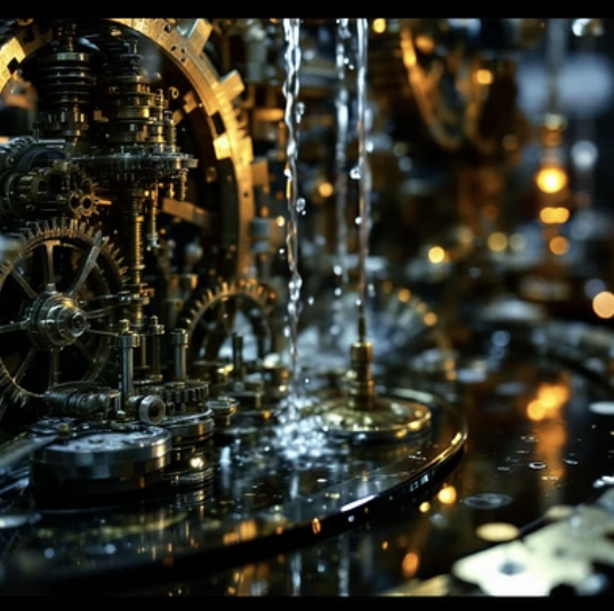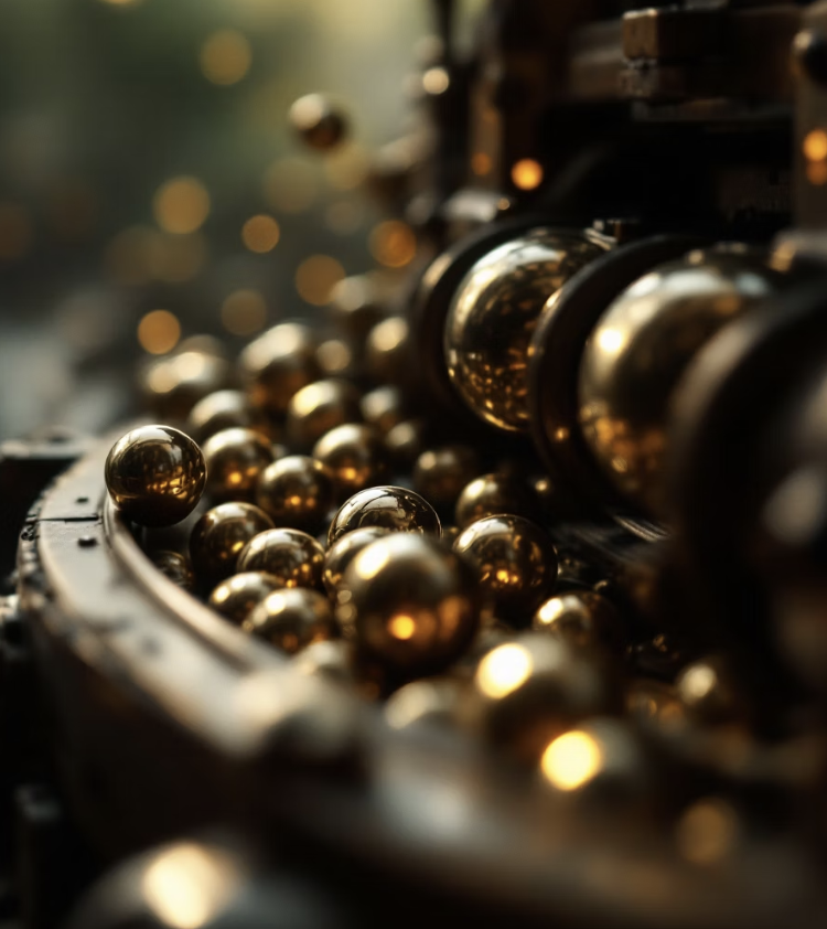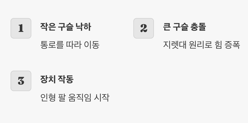 마치 도미노 게임이나 구슬 미로 찾기 장난감처럼 정교하게 설계된 길을 따라 구슬들이 차례로 움직입니다. 이 과정은 전기나 배터리 하나 없이 오로지 중력과 물의 힘, 그리고 구슬의 무게만으로 이루어집니다. 쇠구슬이 굴러가는 힘이 기계 장치를 작동시키는 에너지원이 되는 셈입니다.