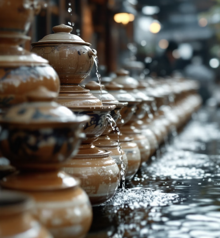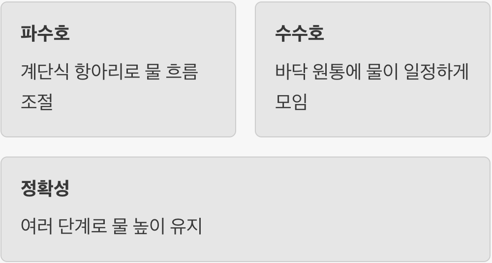 그래서 항아리를 여러 단계로 나누어 두었습니다. 맨 위 항아리의 물 높이가 변해서 물살이 약해지더라도, 중간 항아리가 물 높이를 일정하게 유지해 주는 역할을 합니다. 덕분에 마지막 원통으로 들어가는 물의 양은 항상 똑같아집니다. 마치 수도꼭지를 아주 조금만 틀어서 물방울이 한 방울씩 똑똑 떨어지게 조절하는 것과 같은 원리로 정확한 시간 측정이 가능했습니다.