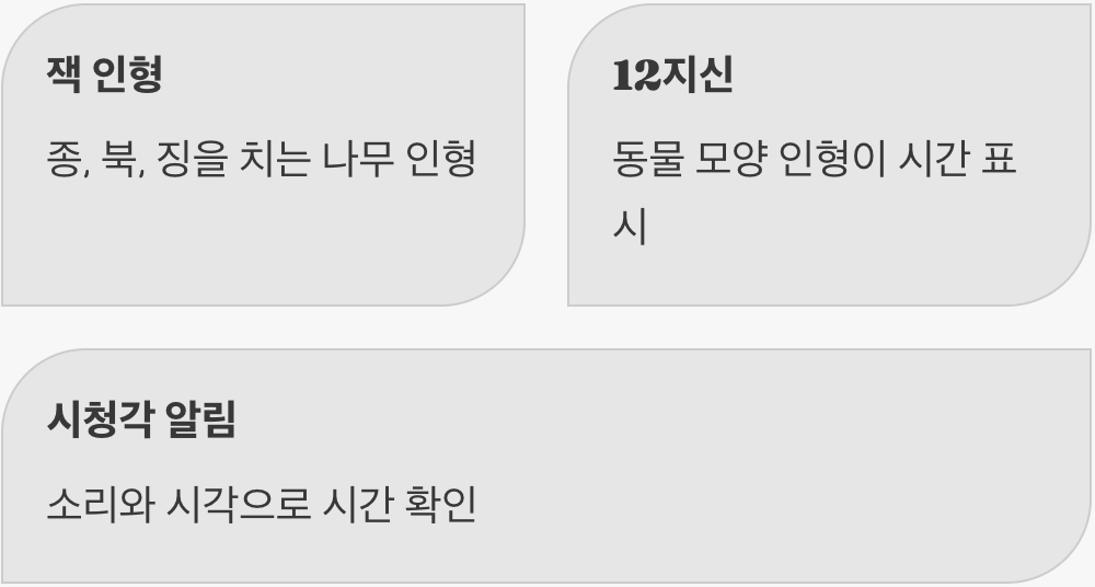 또한 시간을 알려주는 팻말을 든 12지신(쥐, 소, 호랑이 등 동물 모양) 인형이 밖으로 튀어나오기도 했습니다. 소리뿐만 아니라 눈으로도 지금이 자시(밤 11시1시)인지 축시(밤 1시3시)인지 확인할 수 있게 만든 것입니다. 시각과 청각을 모두 활용한 완벽한 알람 시계였습니다.