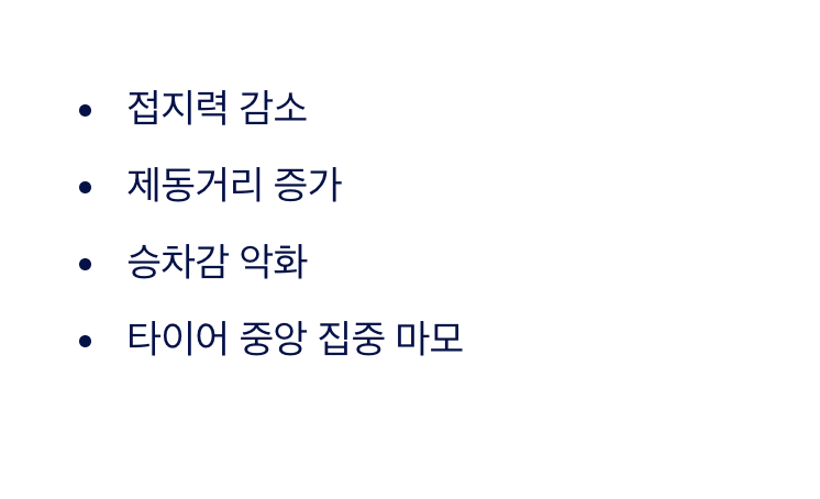 반대로 공기압이 과하면 어떻게 될까요? 타이어는 마치 빵빵하게 분 공처럼 가운데 부분만 볼록하게 튀어나오게 됩니다. 이렇게 되면 도로와 닿는 면적이 비정상적으로 좁아져 접지력이 크게 떨어집니다. 특히 비가 오거나 눈이 내리는 미끄러운 노면에서 급제동 시 제동거리가 길어지고, 코너를 돌 때 쉽게 미끄러질 수 있습니다.