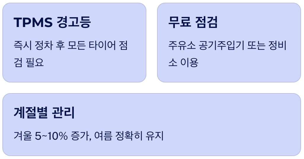 A. 네, 그렇습니다. 위에서 설명했듯 겨울에는 기온이 낮아 공기압이 자연 감소하므로 평소보다 510% 정도 더 채워주는 것이 좋습니다. 반대로 여름철에는 고속도로 장거리 주행 시 공기가 팽창하여 압력이 오를 것을 감안해 권장 압력을 정확히 지키거나, 아주 약간(12psi) 낮게 설정하는 것도 방법이 될 수 있습니다.