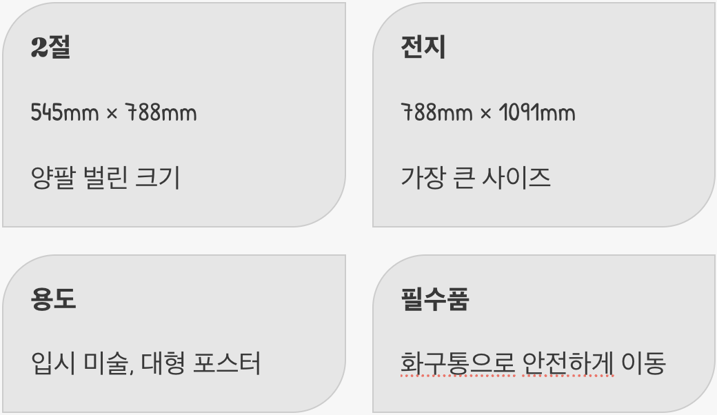 입시 미술을 하거나 대형 포스터, 홍보물을 만들 때는 4절보다 훨씬 큰 종이가 필요합니다. 이때 등장하는 것이 2절(545mm x 788mm)과 전지(788mm x 1091mm)입니다. 2절은 성인이 양팔을 벌려 들었을 때 상반신을 가릴 정도로 큽니다.