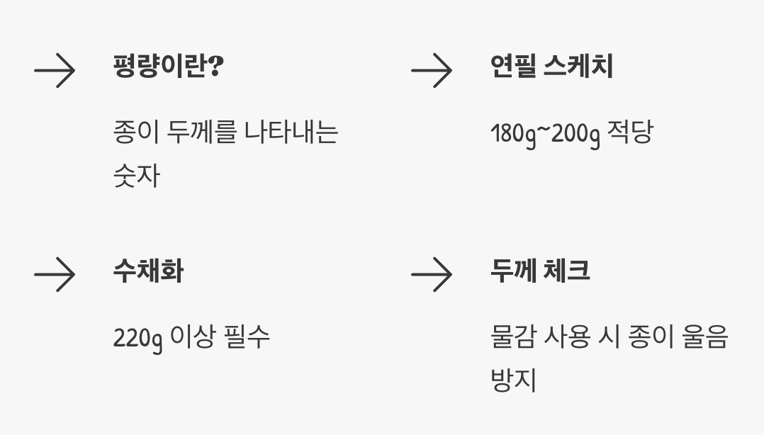 가벼운 연필 스케치만 할 거라면 180g~200g 정도도 괜찮지만, 물감을 사용하는 수채화를 그릴 예정이라면 최소 220g 이상의 도톰한 종이를 선택하세요. 그래야 물을 많이 먹어도 종이가 버텨내고 그림의 완성도가 높아집니다. 크기를 골랐다면 마지막으로 두께를 체크하는 습관이 여러분의 그림 실력을 지켜줄 것입니다.