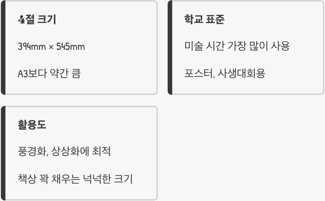 우리가 초등학교나 중학교 미술 시간에 "스케치북 가져와"라고 할 때 쓰는 그 크기가 바로 4절입니다. 정확한 치수는 대략 394mm x 545mm 정도입니다. A3 용지보다 조금 더 크다고 생각하면 이해하기 쉽습니다. 각종 사생대회나 포스터 그리기 숙제도 대부분 이 규격을 표준으로 사용합니다.