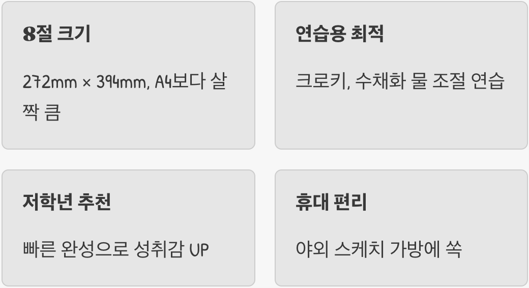 유치원생이나 저학년 아이들이 사용하기에도 부담 없는 크기입니다. 종이가 너무 크면 여백을 채우다가 지칠 수 있는데, 8절은 금방 완성할 수 있어 성취감을 느끼기에 좋습니다. 휴대하기도 간편해서 야외 스케치를 나갈 때 가방에 쏙 넣어 다니기 좋은 사이즈를 찾는다면 8절이 정답입니다.