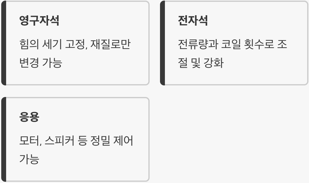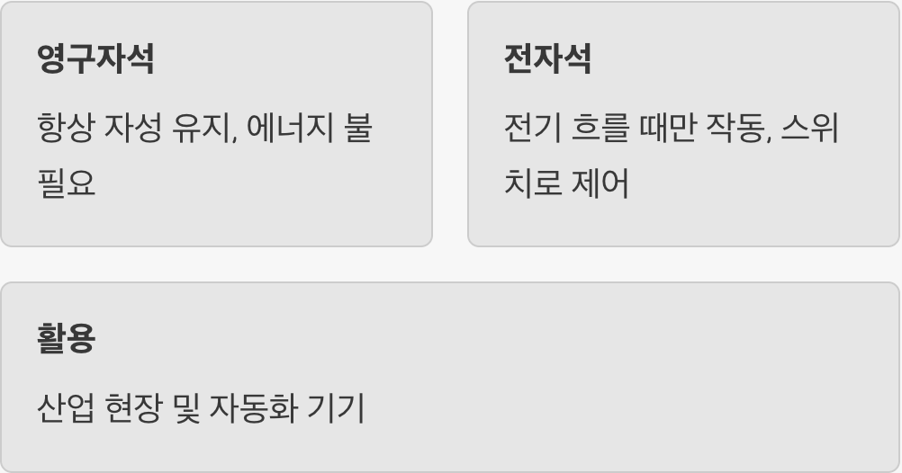 전자석은 전류로 자기장 생성·제어, 영구자석은 재료 자성으로 항상 자력 유지하는 핵심 차이입니다. - 자석과 전자석