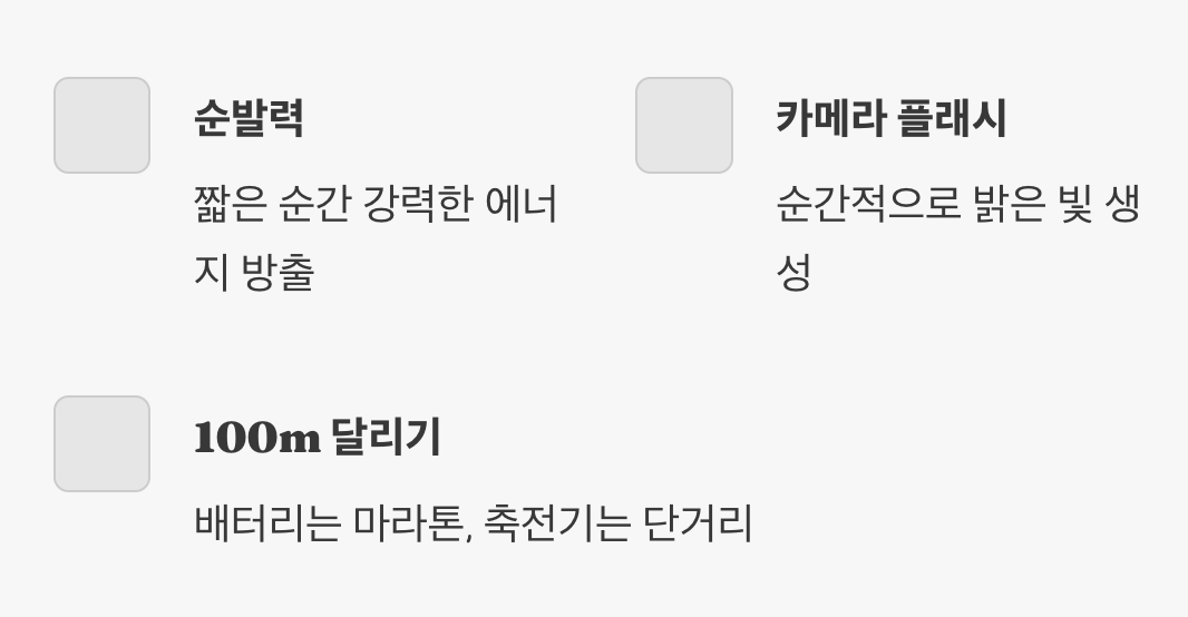 많은 분이 "전기를 저장하면 배터리랑 같은 거 아니냐"라고 질문하십니다. 하지만 둘은 사용하는 목적이 완전히 다릅니다. 배터리가 마라톤 선수라면, 축전기는 100m 달리기 선수입니다. 배터리는 많은 양의 에너지를 천천히 오랫동안 내보내는 데 특화되어 있지만, 한 번에 큰 힘을 내는 데는 약합니다.