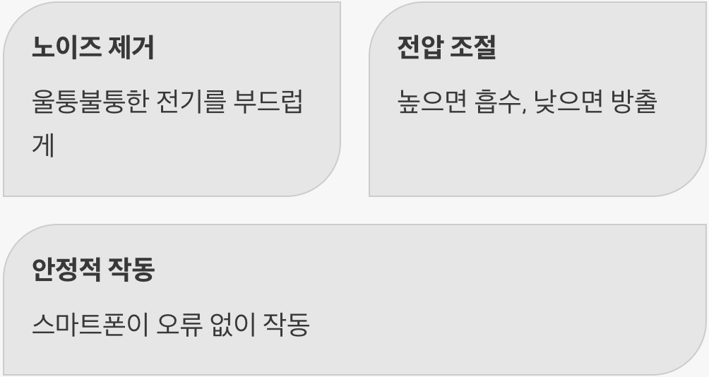 이때 축전기가 정수기 필터처럼 중간에서 활약합니다. 전압이 너무 높게 들어오면 넘치는 전기를 흡수해서 저장하고, 반대로 전압이 뚝 떨어지면 저장해 둔 전기를 내보내서 부족한 부분을 채워줍니다. 덕분에 울퉁불퉁했던 전기의 파도가 잔잔한 호수처럼 변하게 됩니다. 여러분의 스마트폰이 오류 없이 작동하는 것도 다 이 부품이 전기를 깨끗하게 걸러주기 때문입니다.