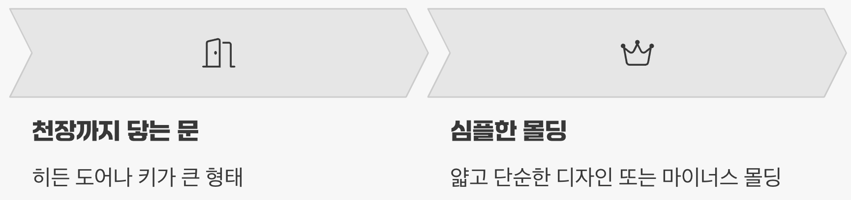 우리가 무심코 지나쳤던 문이나 천장과 벽이 만나는 몰딩 역시, 공간의 높이감에 큰 영향을 미칩니다. 층고가 낮은 집이라면, 방문은 가능한 한 천장까지 닿는 ‘히든 도어’나 키가 큰 형태로 제작하는 것이 좋습니다. 문이 수직으로 길어지면, 벽 전체가 더 높아 보이는 착시 효과를 주기 때문입니다.