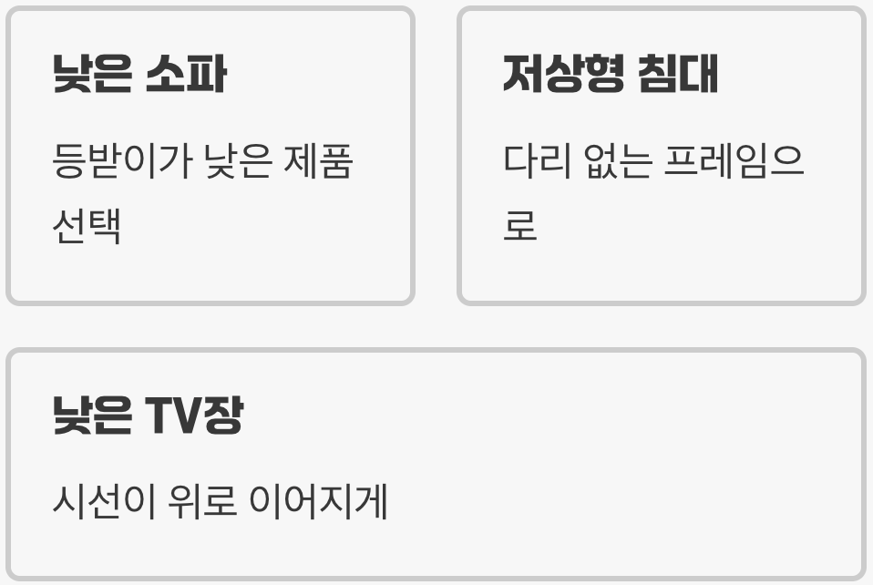 소파는 등받이가 낮은 제품으로, 침대는 다리가 없는 저상형 프레임으로, TV장은 최대한 높이가 낮은 것으로 선택해 보세요. 이렇게 가구의 무게중심을 아래로 내리면, 시선이 바닥부터 벽의 위쪽까지 막힘없이 이어지면서 공간의 상단부가 훤히 트이는 효과를 줍니다. 결과적으로 천장이 훨씬 높아 보이고, 집 전체가 시원하고 넓게 느껴지게 됩니다.