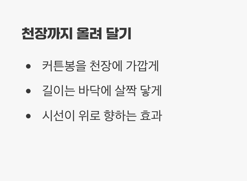 커튼의 마법을 경험하고 싶다면, 커튼 봉이나 레일을 가능한 한 천장에 가깝게, 거의 닿을 듯이 높게 설치해 보세요. 그리고 커튼의 길이는 바닥에 살짝 끌릴 정도로 길게 늘어뜨리는 것이 포인트입니다. 이렇게 하면 시선이 자연스럽게 위쪽으로 향하면서, 마치 천장이 훨씬 더 높아진 듯한 드라마틱한 착시 효과를 얻을 수 있습니다.