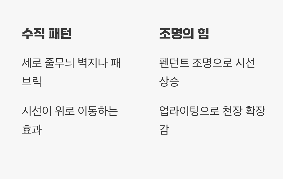 우리의 시선은 반복되는 패턴이나 빛을 따라 움직이는 경향이 있습니다. 이 원리를 활용하여 시선을 자연스럽게 위쪽으로 유도하면, 공간이 수직적으로 길어 보이는 효과를 만들 수 있습니다. 세로 줄무늬 패턴의 벽지나 패브릭이 좋은 예시입니다.