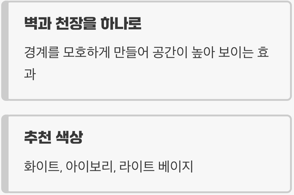 가장 추천하는 색상은 단연 화이트, 아이보리, 라이트 베이지 같은 팽창색입니다. 이 색상들은 빛을 잘 반사하여 공간을 더 환하고 넓어 보이게 합니다. 만약 벽과 천장의 색을 다르게 하고 싶다면, 천장 색을 벽보다 한 톤 더 밝은 색으로 칠하여 시선을 위로 이끄는 방법을 사용하는 것이 좋습니다.