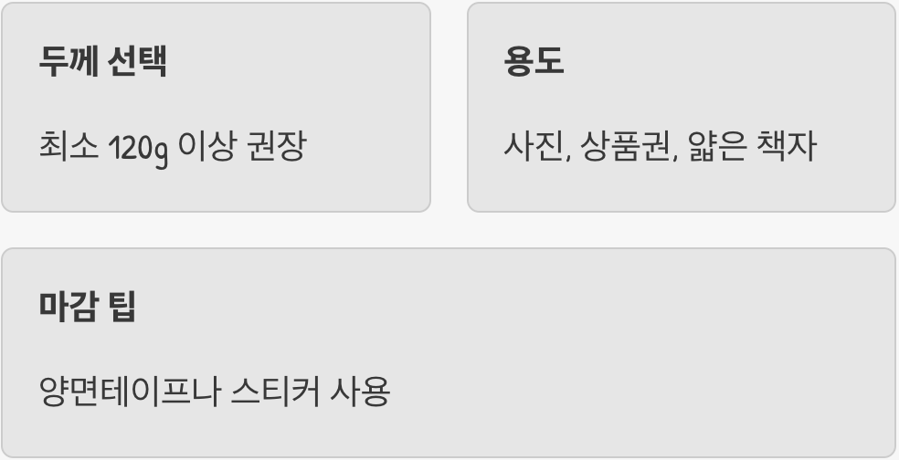 평판형은 사진 엽서, 상품권, 얇은 책자처럼 부피가 거의 없는 물건을 담기에 최적화되어 있습니다. 입구를 마감할 때는 풀보다는 양면테이프를 사용하거나 예쁜 스티커를 붙여주면 훨씬 깔끔합니다. 만약 내용물이 조금이라도 두껍다면 억지로 넣지 말고 다음에 소개할 다른 형태를 찾아야 종이가 터지는 사고를 막을 수 있습니다.