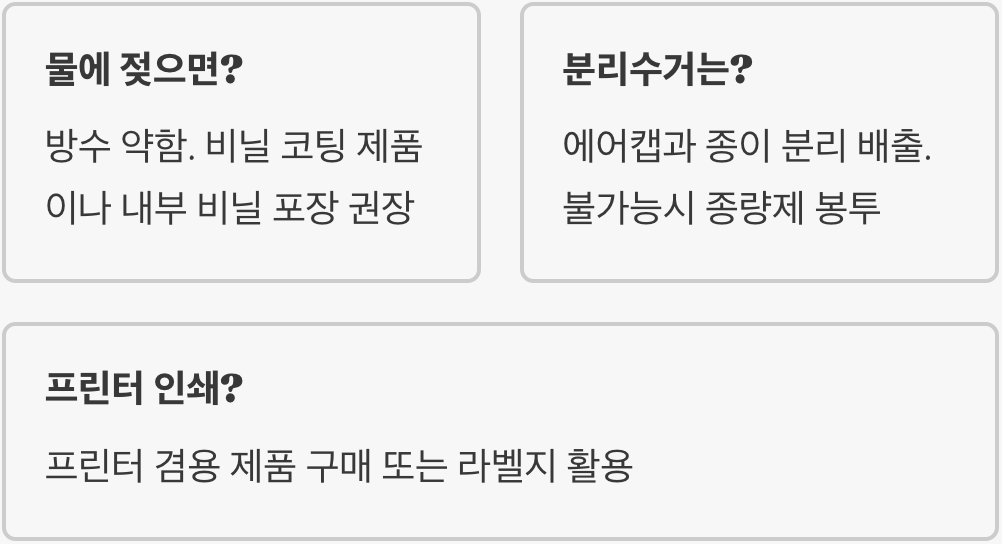 A. 잉크젯 프린터는 잉크가 번질 수 있고, 레이저 프린터는 종이가 두꺼워 걸릴 수 있습니다. 인쇄를 꼭 해야 한다면 '프린터 겸용'이라고 표기된 얇은 두께의 제품을 구매하시거나, 라벨지에 내용을 인쇄해서 붙이는 방법을 추천해 드립니다.