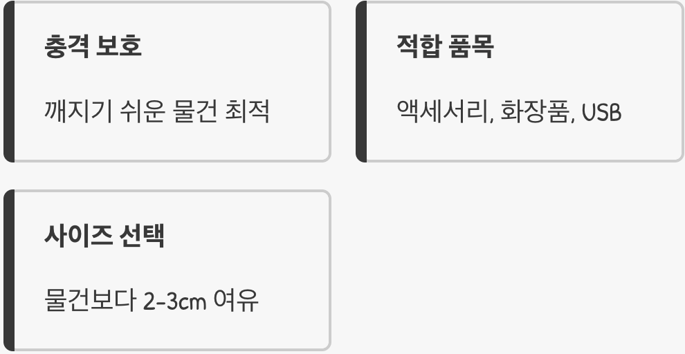 스마트폰 케이스, USB, 작은 유리병 같은 소품을 택배로 보낼 때 이보다 좋은 선택은 없습니다. 다만 내부 에어캡 때문에 겉에서 보는 크기보다 실제 들어가는 공간이 작다는 점을 기억해야 합니다. 실패하지 않으려면 내가 넣으려는 물건보다 가로세로 최소 2~3cm 이상 여유 있는 사이즈를 고르는 것이 현명한 방법입니다.