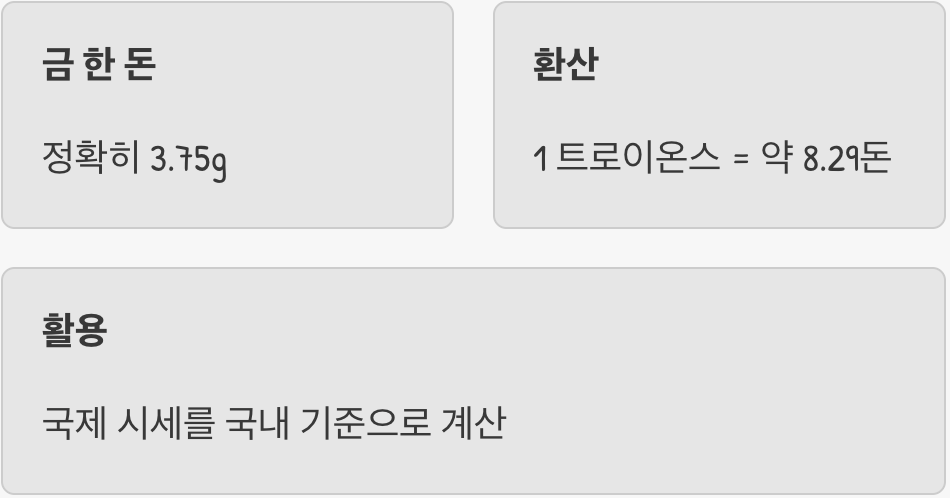 우리에게는 ‘돈’이라는 아주 친숙한 금의 무게 단위가 있습니다. 그렇다면 국제 표준인 트로이온스와 우리나라의 ‘돈’은 어떤 관계가 있을까요? 이 관계를 알면 국제 시세를 우리 실정에 맞게 계산하기가 훨씬 수월해집니다.