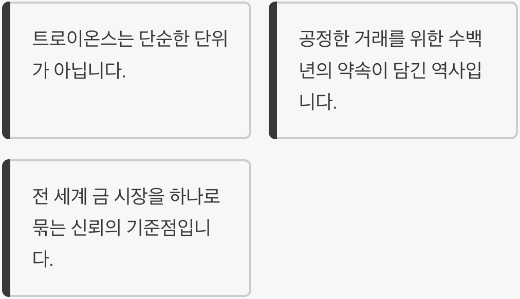 결론적으로, 트로이온스는 단순히 금의 무게를 재는 낡은 단위를 넘어, 그 안에 공정한 거래를 위한 인류의 오랜 지혜와 약속이 담긴 역사 그 자체입니다. 이 작은 단위 하나가 전 세계의 금 시장을 하나로 묶고, 그 가치를 투명하게 유지하는 가장 중요한 기준점이 되어주고 있는 셈이죠.