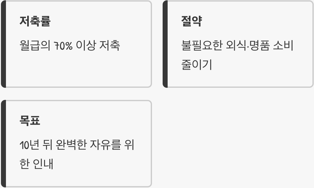 이런 생활이 너무 힘들고 불행해 보일 수도 있습니다. 하지만 이들은 소비에서 오는 일시적인 행복보다, 통장 잔고가 늘어날 때 느끼는 미래의 안정감을 더 중요하게 생각합니다. 지금 조금 불편하더라도 10년 뒤의 완벽한 자유를 위해 기꺼이 인내하는 것입니다. 소비를 통제하는 능력이야말로 조기 은퇴를 가능하게 하는 가장 강력한 무기입니다.