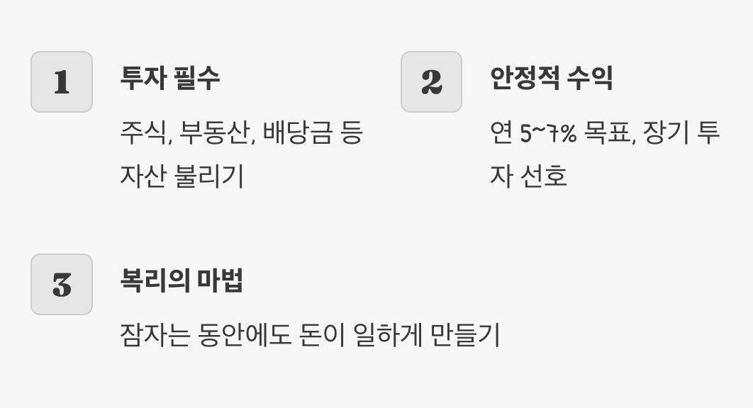 무작정 아끼기만 해서는 목표 금액을 달성하기 어렵습니다. 그래서 필수적으로 공부해야 하는 것이 바로 '투자'입니다. 주식, 부동산, 배당금 등 자산이 스스로 불어나는 구조를 만들어야 합니다. 내가 잠을 자는 동안에도 돈이 일을 해서 이자를 벌어오게 만드는 것이죠.