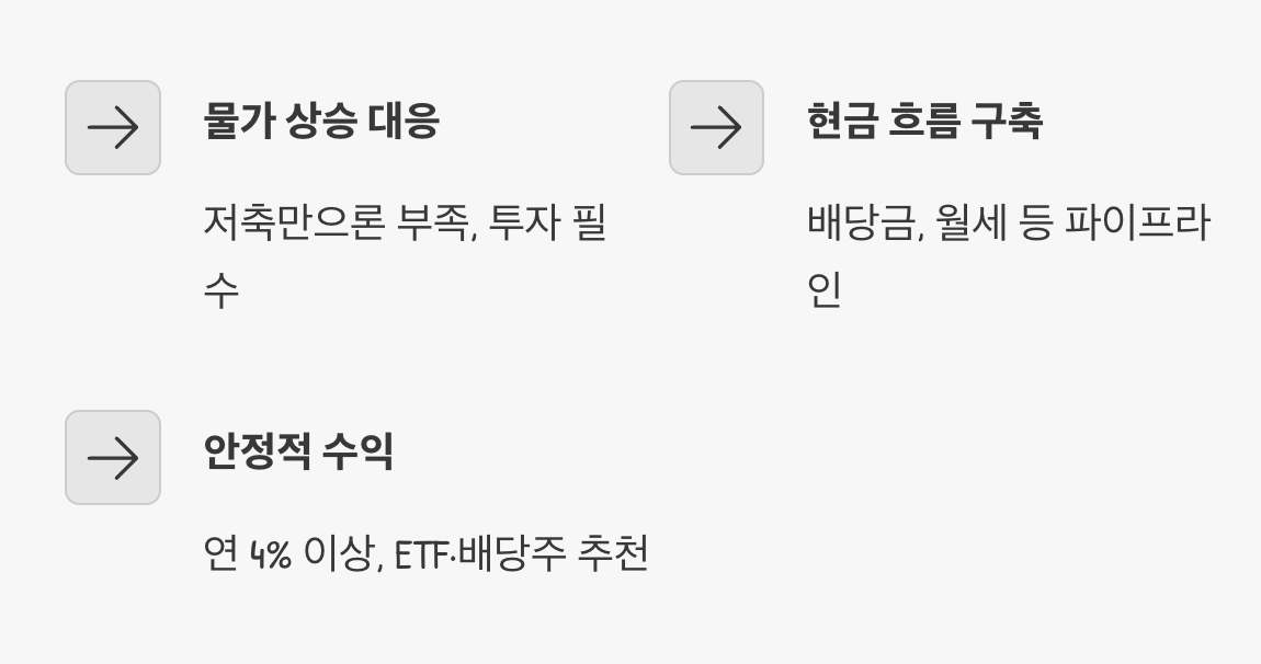 열심히 월급을 모아 은행 예금에만 넣어두는 것으로는 물가 상승 속도를 따라잡기 힘듭니다. 화폐 가치는 시간이 갈수록 떨어지기 때문에, 내 돈이 스스로 불어나게 만드는 투자는 선택이 아닌 필수입니다. 주식 배당금이나 부동산 월세 같은 현금 흐름 파이프라인을 구축해야 합니다.