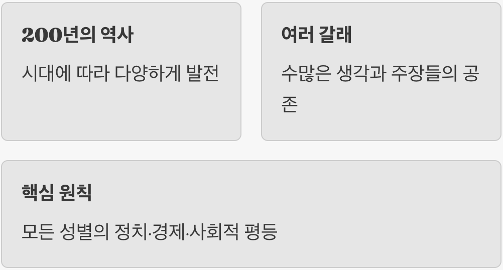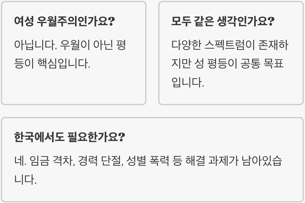 마치 ‘민주주의’라는 큰 나무 안에 수많은 정당과 의견이 존재하듯 말입니다. 따라서 일부의 과격한 목소리가 아닌, ‘모든 성별은 정치, 경제, 사회적으로 평등하다’는 가장 근본적인 대원칙에 집중하는 것이, 이 사상을 올바르게 이해하는 가장 현명한 길입니다.