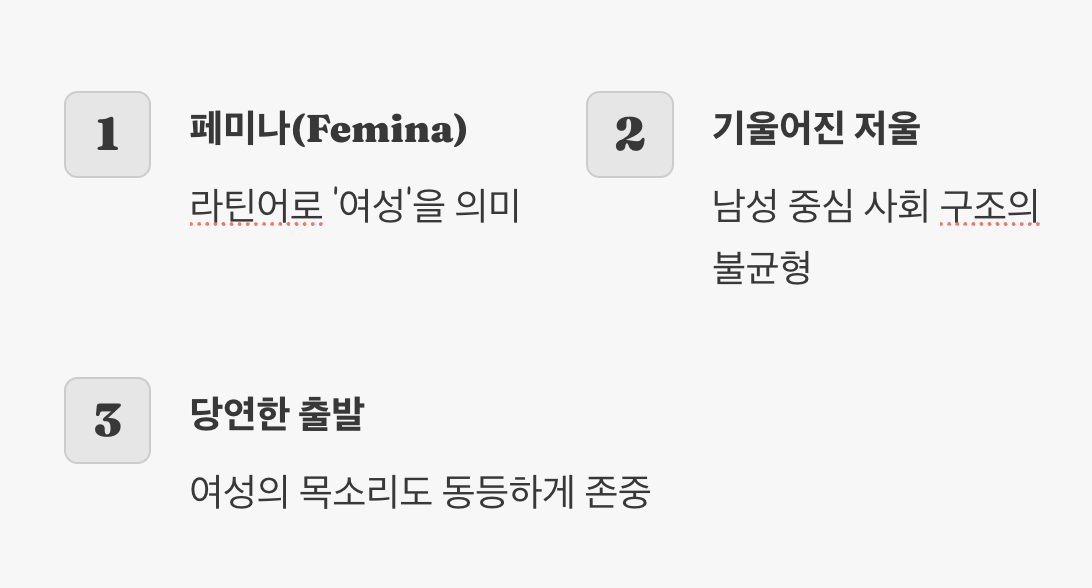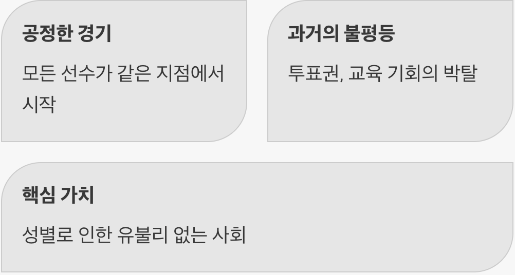과거 여성들에게는 투표할 권리도, 동등한 교육을 받을 기회도 주어지지 않았습니다. 수많은 여성 운동가들의 노력 덕분에 우리는 지금 당연하게 이 모든 것을 누리고 있죠. 이처럼 성별 때문에 누군가가 더 유리하거나 불리하지 않은 공정한 사회를 만드는 것, 그것이 바로 이 운동이 추구하는 가장 핵심적인 가치입니다.
