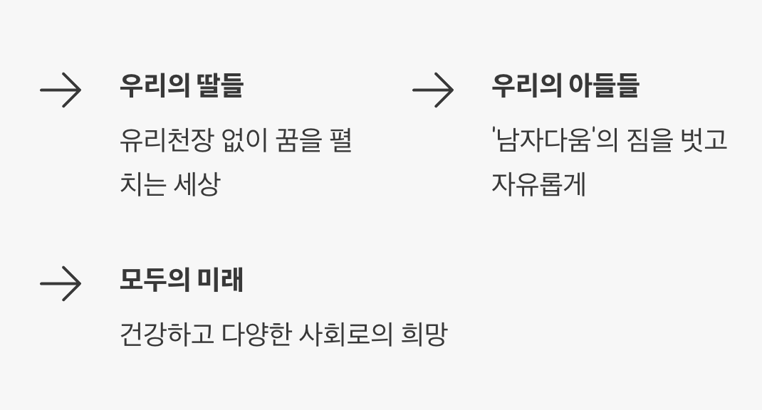 물론, 이는 우리의 아들들을 위한 약속이기도 합니다. 우리의 아들들이 ‘남자다움’이라는 무거운 짐을 벗어 던지고, 타인을 존중하며 더불어 살아가는 건강한 사회 구성원으로 성장하기를 바라기 때문입니다. 결국 페미니즘은 우리 모두의 미래를 위한 약속이자, 더 건강하고 다양한 사회로 나아가기 위한 희망의 이름입니다.